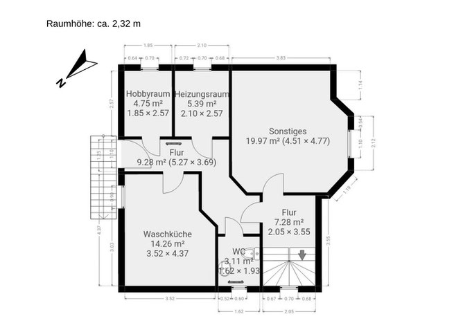 Im Keller befinden sich neben dem "Fitnessraum" und der Waschküche drei kleinere Räume: Heizungsraum, Hobbyraum, ein zusätzliches WC und der Flur. Alle Räume verfügen über ein Fenster mit Lichtschacht und sind gefliesst. Im Fitnessraum ist eine Dusche verbaut; auch war der Einbau einer Sauna vorgesehen.